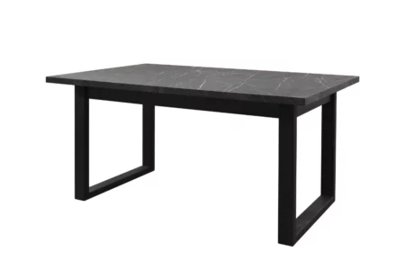 Der Esstisch Edit vereint hochglänzendes Granitdesign mit mattschwarzen Metallbeinen und