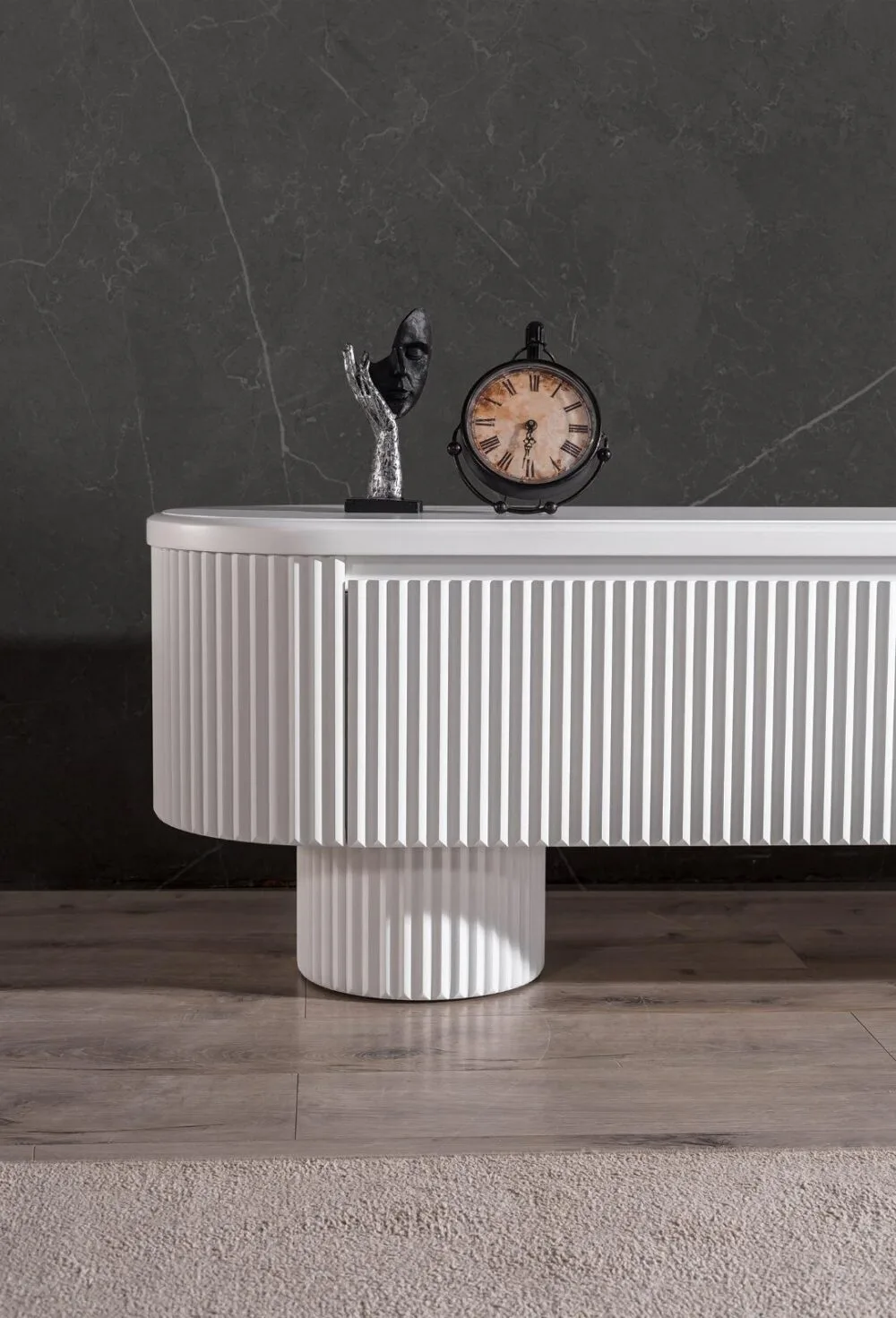 Die TV-Kommode Milano Weiß kombiniert moderne Ästhetik mit praktischer Funktionalität. Die matte MDF-Oberfläche verleiht ihr einen eleganten Look, während die zwei geräumigen Schubladen für eine ordentliche Aufbewahrung sorgen. Die stabilen MDF-Füße mit einer Höhe von 20 cm runden das stilvolle Design perfekt ab – ideal für moderne Wohnzimmer.